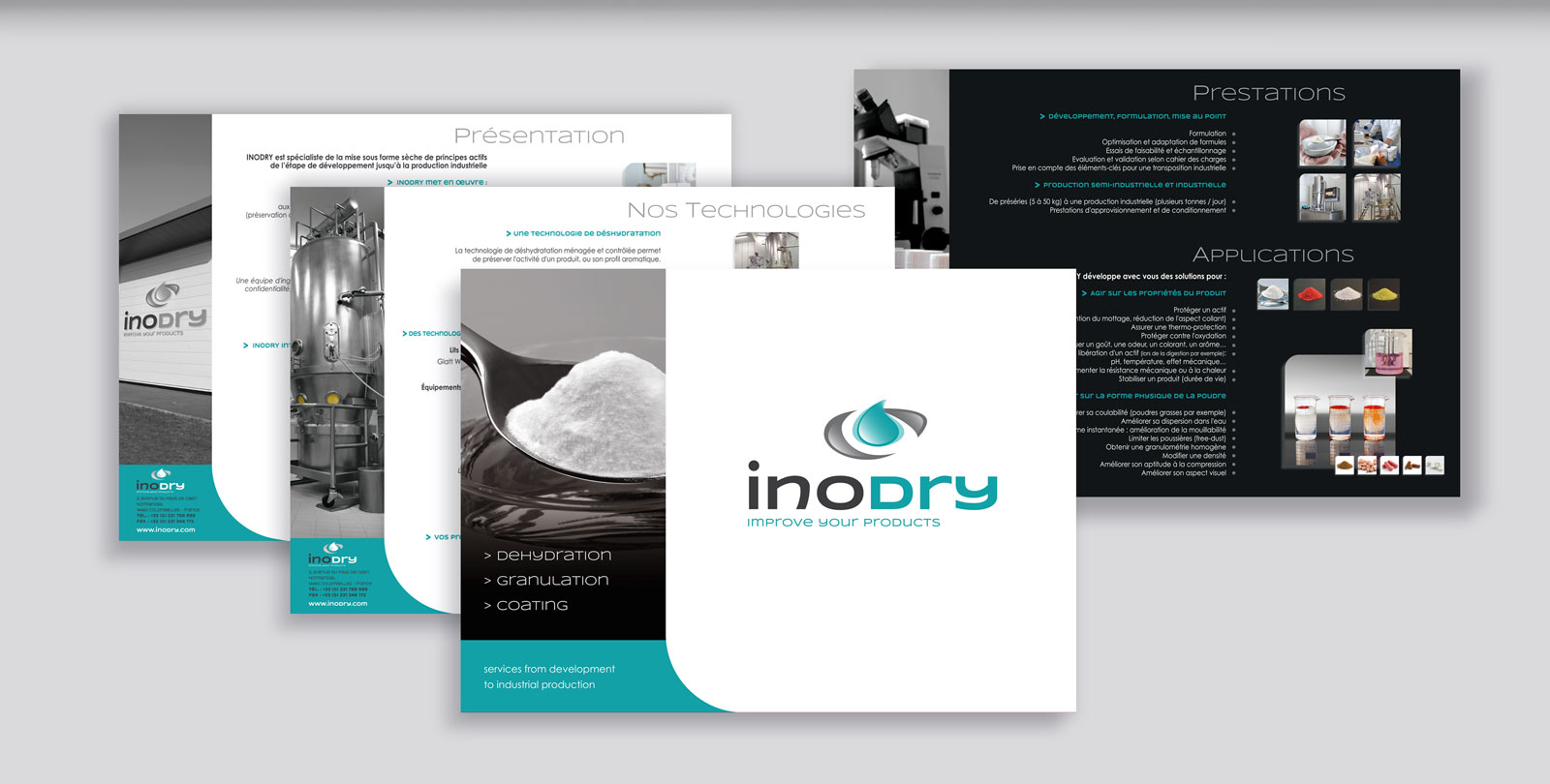 INODRY : du dossier presse à la pochette institutionnelle, en passant par les cartes de visite, flyers, nous avons réalisé tous les documents. Ainsi le client possède tout ce qui explique ce qu’est l’enrobage, la granulation et la déshydratation